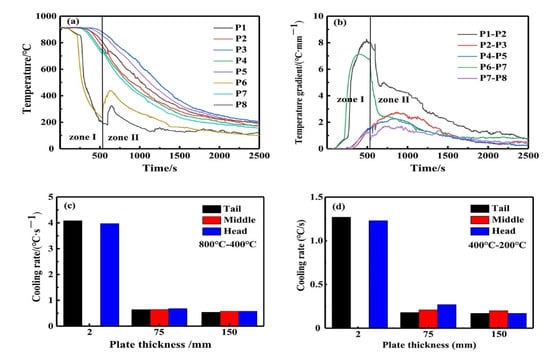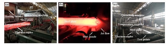 Ultra-heavy steel plates with large single weight and large section are important basic materials used in the fields of marine engineering, energy chemical industry, hydropower, nuclear power, and construction machinery [,]. Quenching is a common heat treatment process in the production of ultra-heavy plates. However, due to their large thickness, a significant temperature gradient from the surface to the center may appear during quenching, which can lead to a significant cross-section effect, causing great differences in the microstructure and properties of an ultra-heavy steel plate [,]. Therefore, it is of great significance to investigate the cooling rate and temperature gradient of ultra-heavy plates during quenching, in order to improve the quenching process and the resulting uniformity of the material microstructure and properties.