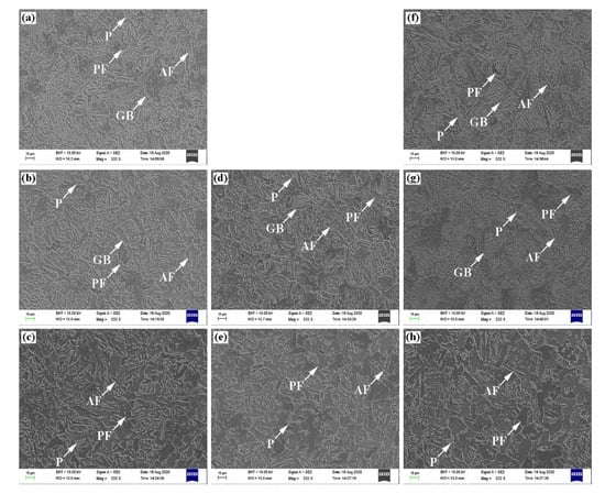 SEM microstructure of steel plate at the different temperature measurement points. Images (a–h) demonstrate the microstructure at points P1–P8, respectively.