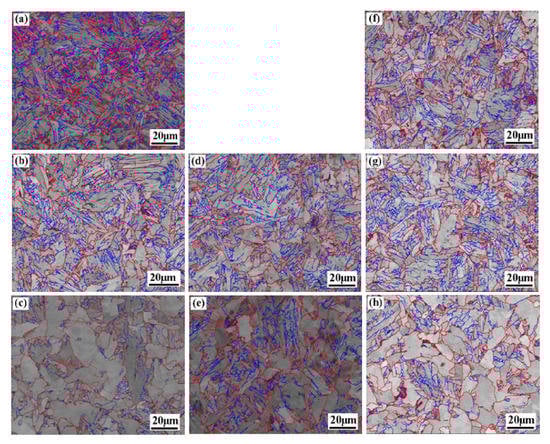 Figure 6 shows the crystallographic characteristics of the tested steel specimens analyzed by EBSD. Blue lines represent low-angle boundaries (2–15°), and the red lines correspond to high-angle boundaries (>15°) []. The grain boundaries between laths in bainite were mainly low-angle grain boundaries, most of which were observed at the 1/4-thickness position of the steel plate. The grain boundaries between polygonal ferrites were principally high-angle grain boundaries [,], most of which were observed at the 1/2-thickness position of the steel plate.