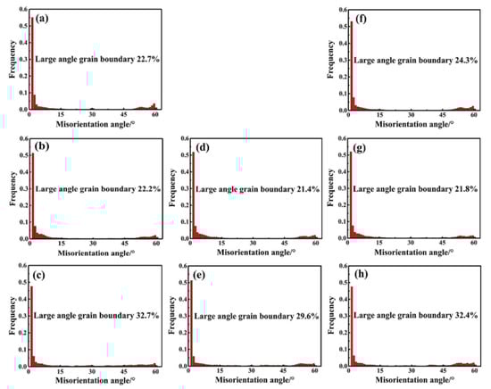 Grain-boundary misorientation angle distribution at the different temperature measurement points. Images (a–h) show the results for points P1–P8, respectively.