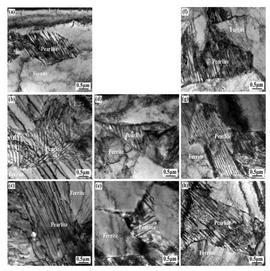 As it can be observed in Figure 8, the pearlite interlamellar spacing at the upper surface of the steel plate was 0.09 μm at the head and 0.08 μm at the tail; at the 1/4-thickness position of the steel plate, it was 0.11 μm at the head, 0.13 μm at the middle, and 0.15 μm at the tail; at the 1/2-thickness position of the steel plate, it was 0.14 μm at the head, 0.17 μm at the middle, and 0.19 μm at the tail. The pearlite interlamellar spacing increased gradually along the thickness direction of the plate, while it was relatively uniform with little changes along the length direction of the plate. According to Figure 3, the cooling rate decreased gradually along the thickness direction of the plate, which was inversely proportional to the behavior of the pearlite interlamellar spacing. The higher the cooling rate, the finer the pearlite interlamellar spacing. This is attributed to that when the cooling rate increased, the carbon concentration in austenite increased. At the same time, due to the decrease in temperature, the activity of the atoms was weakened and the diffusion distance was shortened, leading to a decrease in pearlite interlamellar spacing [,,,].