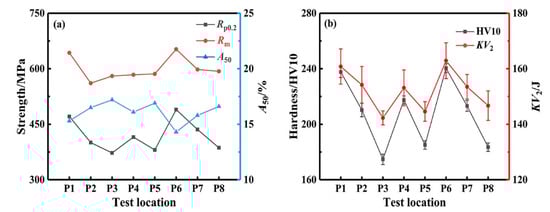 Mechanical properties at the different temperature measurement points. (a) Strength and elongation, (b) hardness and impact energy.