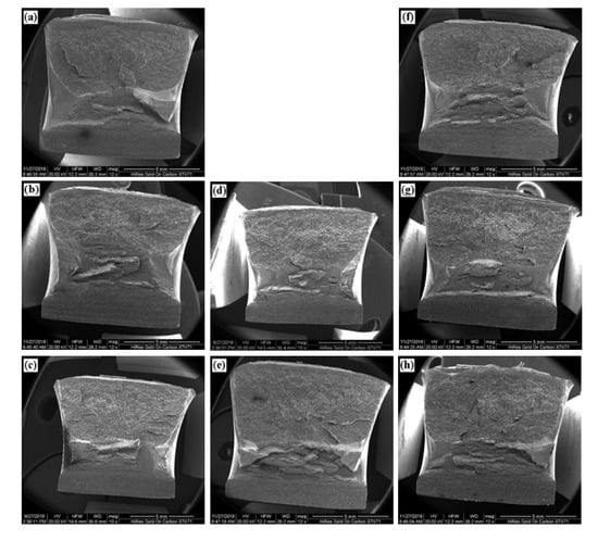 Impact fractographs of the fibrous zone at the different temperature measurement points. Images (a–h) exhibit the results for points P1-P8, respectively.
