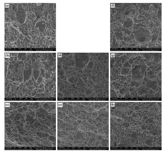 As shown in Figure 11, the amount of large dimples and their depth decreased gradually along the thickness direction of the plate, which was similar to the change trend of the impact energy in Figure 9b. The amount and depth of dimples was relatively uniform with little changes along the length direction of the plate. According to Figure 4, the more uniform the microstructure, the finer the grain size, the greater the resistance to crack formation and propagation, and the better the impact properties [,,].