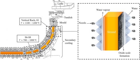 - Köhler, C.; Jeschar, R.; Scholz, R.; Slowik, J.; Borchardt, G. Influence of oxide scales on heat transfer in secondary cooling zones in the continuous casting process, part 1: Heat transfer through hot-oxidized steel surfaces cooled by spray-water. Steel Res. 1990, 61, 295–301. [Google Scholar] [CrossRef]