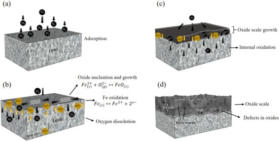 In principle, the oxidation of metals may occur among different chemical reactions (e.g., the reaction of a metal and oxygen gas) to form an oxide. For instance, for pure iron, the oxidation process is governed by the reaction of iron ions (Fe2+) with oxygen in the atmosphere (O2); this is given by xFe + (y/2) O2 = FexOy. The reaction of iron with oxygen in the atmosphere results in different type of oxides identified as wüstite, magnetite, and hematite (FeO, Fe3O4, and Fe3O2, respectively). This reaction involves a variety of stages for an oxide scale to form as either a film or as separate oxide nuclei. The process begins with the adsorption of oxygen on the iron surface at the iron/oxygen interface. The reaction continues with the dissolution of oxygen in the iron substrate, which act as a nucleation site for the oxide scale nuclei to form and grow [19,20]. Therefore, both the adsorption and diffusion depend on the metal surface conditions (e.g., rugose and clean) and defects (e.g., crystal defects, cracks, inclusions, and porosity). The oxidation rate is controlled by the solid-state diffusion of ions through the scale, which occurs when the oxygen concentration is sufficiently high at the oxide surface [21]. Finally, the nucleated oxide scale on the surface grows with time by increasing thickness, and the rate of growth of the developed oxide decreases with time [19]. During oxide scale growth, some defects may form inside the oxide scale such as micro-cracks, cavities, and porosity. A schematic illustration of the oxidation phenomena on pure iron is shown in Figure 2.