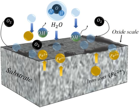During continuous casting, oxide scale formation initiates below the primary cooling zone (mold) where the steel is in complete contact with oxygen from the environment and water from the cooling. Thus, the principles of oxidation under water vapor differ significantly to that which occur in the dry air condition because the presence of water molecules accelerates the oxidation process. At high temperatures, the susceptibility of oxidation increases, thus leading to oxide scale growth at a relatively high rate. Thus, under a water-saturated atmosphere, the oxygen from the air and the water from the cooling change the oxidation process, resulting in thicker oxide scales. Oxide scale growth under water vapor follows similar mechanisms to that under dry conditions, though it has higher diffusion rates. In the presence of water, the oxidation state of iron ions increases due to the oxygen coming from the water molecules. The reaction between the electrons from the iron atoms and the water molecules forms hydroxides (OH) [22,23]. The OH interact with the iron ions, which results in iron hydroxides (Fe(OH)2) formed on the steel substrate (also known as rust); see Figure 3. The formation of OH that diffuse through the metal oxide speeds up the oxidation process, resulting in thicker scales [19,21,22,24].