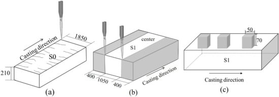 As the initial step, specimens were sectioned from an HSLA steel slab with 0.15 wt.% C containing Nb and V as the main alloying elements with dimensions of 1850 and 210 mm for width and thickness, respectively (S0 Figure 5a). In addition, the center piece from S0 was sectioned to ensure a material without corner cracks and other defects; this is identified as S1 in Figure 5b. Finally, S1 was sectioned to obtain specimens with dimensions of 50 × 70 mm for the oxidation experiments; see Figure 5c.
