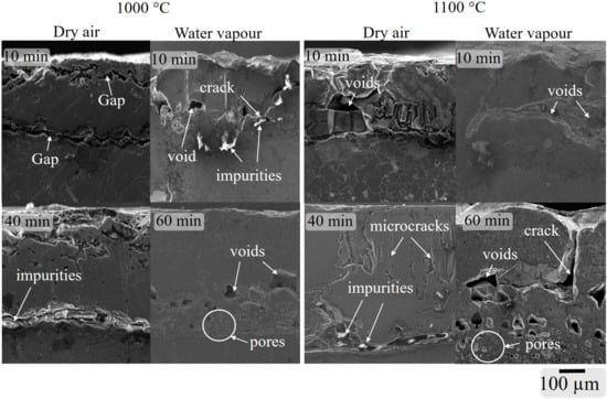 Graphically, it can be seen in Figure 9 that oxide scales grew faster in the presence of water vapor than in the dry air condition. As the temperature increased, thicker scales formed, which clearly occurred for specimens oxidized under dry air. However, the scales formed under water vapor showed some differences between 1000 and 1100 °C. For instance, thicker oxides were observed for the lowest temperature (1000 °C), while thinner oxides formed when the temperature increased to 1100 °C. These changes were observed after 10 min of holding. Furthermore, oxides formed after 30 min did not show significant thickness changes at the same temperatures (i.e., 1000 and 1100 °C). These unexpected changes could have been related to defects formed during oxidation (e.g., voids and cracks) that were more significant at 1000 than at 1100 °C.