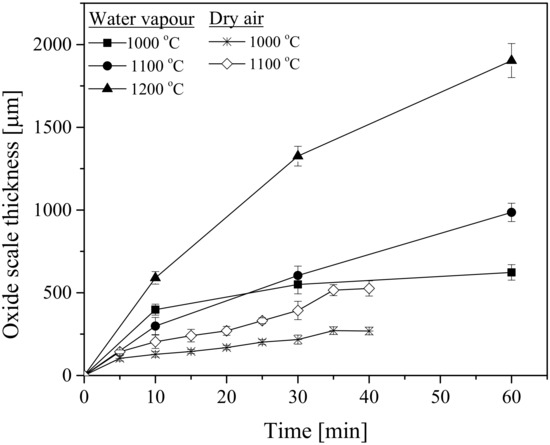 The temperature and time on oxidation behavior was found to have a significant impact on the kinetics and thickness of the scale, especially during oxidation under the water vapor condition. Special attention is given to the oxidation under water vapor in this section due to its closer relationship with the environmental situation during the CC process (e.g., secondary cooling).