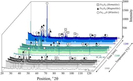 The results in Figure 10 show a comparison of X-ray diffraction patterns obtained from oxides formed under dry air and water vapor treated at different temperatures and holding times. The different peaks correspond to different phases such as wüstite, magnetite, and hematite, which are marked with different symbols.