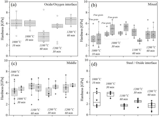 Hardness values of phases formed at the (a) oxide/oxygen, (b) mixed, (c) middle, and (d) steel/oxide interfaces.