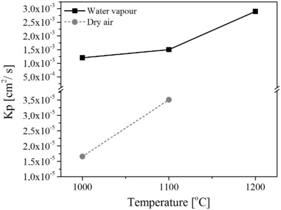 The parabolic rate constant (kp) showed higher values for oxidation occurring under the water vapor condition than the dry air condition, for which the oxidation rate increased with the temperature, as shown in Figure 13. Generally, it was clear that the interaction of the steel with the water vapor particles in the environment led to a faster oxidation process in comparison with oxidation under the dry air condition. However, the apparent lower oxidation rate at 1100 °C could have been more related to the experimental procedure and less significant to the oxide scale behavior.