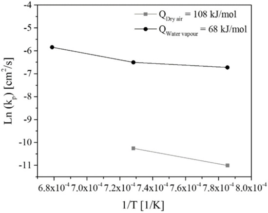 The activation energy for parabolic growth was determined by using the Arrhenius expression based on Equation (9). The results revealed that the activation energy needed for oxidation under dry air was larger than that for oxidation under water vapor at 108 and 68 kJ/mol, respectively; see Figure 14. The value obtained for the dry air condition was only considered an approximation due to the poor data points from the temperatures used during the experiments.