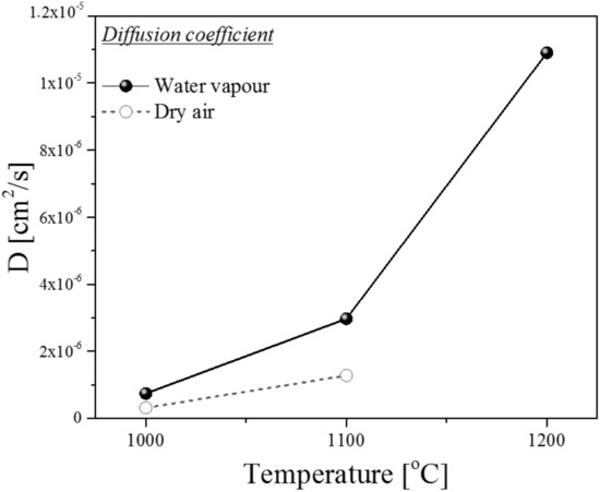 where x is the thickness of the oxide scale (distance) expressed in centimeters, t is the oxidation time expressed in seconds, and D is the diffusion coefficient of oxygen through the oxide scale expressed in (cm2/s). In this case, D could be obtained through the direct linear regression of the data from the experiments (i.e., thickness vs. time). The results showed that the diffusion coefficient increased with temperature for both air and water vapor conditions, as shown in Figure 16. This means that the oxygen atoms travelled through the oxide scale faster at higher temperatures because the steel was more susceptible to oxidation and even more so under the water vapor condition.
