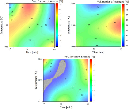 The fraction distribution of phases (e.g., wüstite, magnetite, and hematite) as a function of temperature and time was accomplished only for oxides formed under the water vapor condition. Figure 17 shows a significant fraction of wüstite in all specimens, especially at higher temperatures for the medium and longer holding times (i.e., 30 and 60 min, respectively) where the maximum value ranged between 64.2% and 76.3% (red and yellow zones, respectively). Wüstite formed at higher temperatures is associated with a so-called reversible reaction, which implies that it forms from the reduction of hematite that also forms at high temperatures [36]. The reduction of hematite occurs while passing through magnetite and ending as wüstite, which might occur when phases react with gases such as CO (formed during decarburization) or H2 (in contact with the water vapor) [22]. A combination of magnetite and hematite was found where the volume fraction increased with time at the medium temperature (i.e., 1100 °C). Additionally, lower values (in blue) were present at 1200 °C after 30 min of holding time. Finally, the volume fraction of hematite was more significant at 1200 °C for the lowest and the highest holding times (i.e., 10 and 60 min, respectively). Lower values of hematite were randomly distributed at all oxidation temperatures, especially for oxides formed after 10 min.