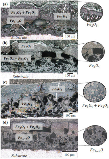 The microstructural analysis of the oxide scales was performed by applying a standard metallographic method. Samples were sectioned and ground with SiC abrasive papers with 600, 1200, and 4000 mesh sizes. Polishing was performed by diamond abrasive solutions down to a 1 µm size and a master colloidal silica solution as the last step. After polishing, specimens were etched with a 5% Nital solution for 7–10 s. To reveal different phases present in the oxide scales, two different etching solutions were applied—one for revealing wüstite and magnetite [30] and the other for hematite [31]. The first etchant consisted of a combination of citric acid and sodium thiocyanate (for wüstite and magnetite) applied on the oxide surface for 30 s. Subsequently, chloral (1% HCl and ethanol) was applied onto the previously etched surface, which revealed hematite after submerging the specimens for 30 s.