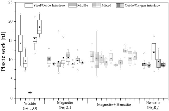 The micromechanical properties of the oxide scales were important in this work since they had an indirect effect during cooling in the CC process, and they comprised one of the reasons for the surface quality issues on the steel slabs. For instance, the plastic properties in wüstite increased significantly to 20 GPa in comparison with magnetite and hematite, where values remained almost the same (10 GPa), as shown in Figure 19.