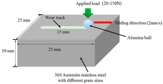 Friction and wear properties of the 304 stainless steels were tested using a pin-on-plate sliding configuration, as shown in Figure 1. All the testing was carried out in ambient environment with a temperature of 20 °C and a relative humidity of about 20% on an R-tech muti-functional tribometer (Rtec Instruments, San Jose, CA, USA). The ball pin was made of alumina with a Vickers hardness of around 2000 VHN and a diameter of 6.5 mm. Dry sliding tests were conducted on the surface of the 304 stainless steels with different grain sizes. Applied loads were varied from 20 N to 150 N and a constant sliding velocity of 2 mm/s were adopted in the experiments. Each testing was repeated 5 times. The variation of COF with sliding distance was recorded and the worn morphologies were subjected to microstructure characterization.