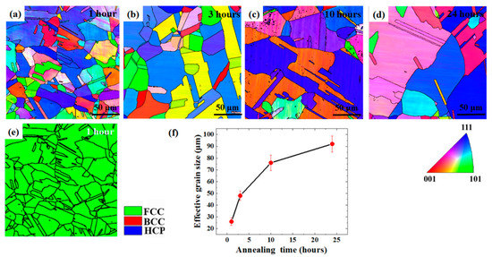 Inverse pole figure (IPF) map of the 304 stainless steels after annealing at 1100 °C for different time durations: (a) 1 h, (b) 3 h, (c) 10 h, and (d) 24 h. (e) Phase map of the microstructure corresponding to Figure 2a. (f) Variation of initial effective grain size of the 304 stainless steel samples with annealing time.