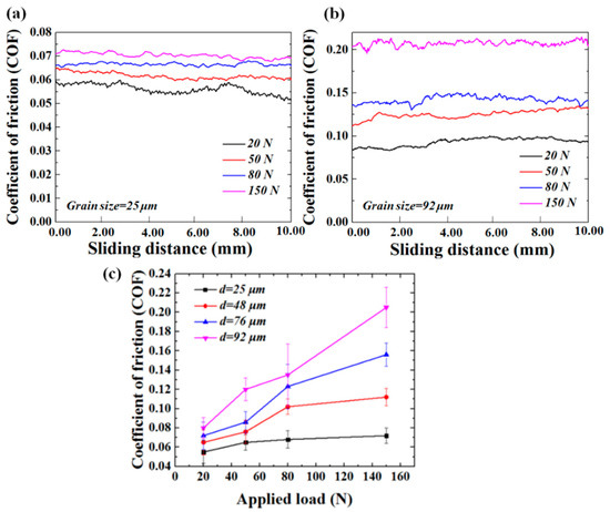 Variation of surface coefficient of friction (COF) with sliding distance of the 304 stainless steel sample with grain size of (a) 25 μm and (b) 92 μm at different applied loads. (c) Effect of grain size on the COF of the 304 stainless steels at different applied loads.