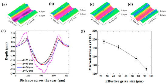 3-D-surface profiles of the wear tracks of the 304 stainless steel samples with different grain sizes subjected to dry sliding with an applied load of 150 N: (a) d = 25 μm, (b) d = 48 μm, (c) d = 76 μm, and (d) d = 92 μm. (e) Cross-sectional profiles of the worn surfaces of the samples with different grain size. (f) The variation of surface micro-hardness with effective grain size for the 304 stainless steel samples.