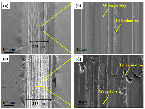 To further characterize the effect of the grain size on the wear behavior of austenite stainless steel, the worn surfaces of the samples were examined by SEM. Figure 5 shows the surface morphologies of the samples with grain sizes of 48 and 92 μm after the dry sliding test with an applied of 80 N. It can be seen that the wear track consists of large amounts of micro-grooves. The width of the wear track for the sample with grain size of 48 μm is 234 μm (Figure 5a), which is smaller than that of the sample with grain size of 92 μm (312 μm in Figure 5c). Moreover, by checking the enlarged view of the wear track, it can be seen that both micro-cutting and surface delamination occurred during dry sliding of the sample with a grain size of 48 μm (Figure 5b). The surface delamination is an indication of severe adhesive wear, which has also been observed in other studies [24,25]. The surface delamination is more serious and some wear debris can be identified in the wear track of sample with a grain size of 92 μm as shown in Figure 5d, indicating the decreased wear resistance of 304 stainless steel with the increase of grain size. More specifically, it can be seen that by refining the austenite grain size, the adhesive wear component can be reduced.