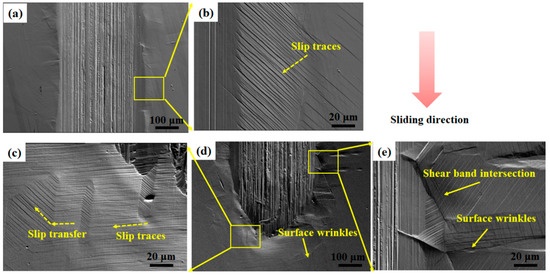 Friction-induced microstructural evolution makes a significant impact on the tribological behavior of metallic materials [8,26]. To investigate the microstructural evolution of 304 stainless steel during dry sliding, the wear track morphology was first examined by SEM. Figure 6 shows the SEM image of the worn surface of the steel sample with a grain size of 76 μm after dry sliding test with an applied load of 150 N. The middle area and front area of the wear track were examined and shown in Figure 6b,d, respectively. It can be seen that a considerable amount of slip traces was revealed besides the wear track, as shown in Figure 6b, due to the surface pile-up effect induced by the displacement of the materials. Figure 6c shows an enlarged view of the morphology in the front part of the wear track. It can be seen that the direction of the slip traces changes among different grains. Some slip-transfer effect can be identified in Figure 6c. Moreover, shear band intersection can be observed in Figure 6e, which can be acted as the nucleation site for stress-induced martensite [27]. Mateo et al. [28] showed that as the dislocation pile-up at the gran boundaries accumulate to a critical value, shear band forms and triggers the nucleation of martensite. Some surface wrinkles can be also identified in Figure 6d,e. The surface wrinkle may affect the tribological properties of 304 stainless steel through two different ways. First, it changes the surface morphology and affects the volume of the materials that continuous sliding need to shear [29]. Secondly, it might correspond to the hard martensite phase and affect the plasticity of the materials in front of the wear track [30]. All these two factors will significantly affect the plowing effect during dry sliding [31].