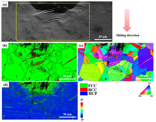 To have a better understanding of the friction-induced martensitic transformation behavior, the front part of the wear tracks was analyzed by EBSD. Figure 7 shows the SEM image of the front part of the wear track of austenite steel sample with a grain size of 48 μm after dry sliding test with an applied load of 80 N. The area marked by yellow dash line in Figure 7a was analyzed by EBSD and the results are shown in Figure 7b–d. It can be seen that some lath-like martensite plates, which are marked by red color in the phase map in Figure 7b, were formed in the front part of the wear track. Moreover, it seems that martensite preferentially nucleated in some austenite grains with a {111} texture (marked by blue color in the IPF map in Figure 7c). One possible reason to account for this phenomenon might be the fact that those austenite grains have their {111} planes parallel to the sliding direction. Therefore, dislocation slips on the {111} planes can be easily activated and trigger the formation of shear bands. Figure 7d shows the kernel average misorientation (KAM) map of the microstructure in the front part of the wear track; it can be seen that considerable high misorientation distributions occurs near the wear track. Moreover, high misorientation distributions can be also found near the martensite-austenite interface in the front part of the wear track. This local misorientation corresponds to the geometrically necessary dislocations (GND) induced by the martensitic formation and further affects the continuous deformation of austenite during dry sliding [32].