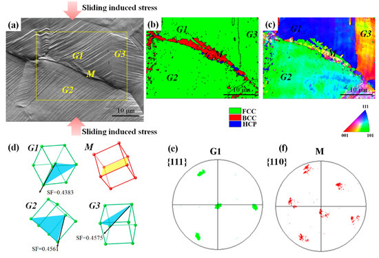 In-depth analysis of the friction-induced martensite formation was carried out by SEM and EBSD with a fine step size. Figure 8a shows the SEM image of an area in the front part of the wear track. Three grains, G1, G2, and G3, with different slip trace directions are marked. EBSD analysis was performed on the area marked yellow dash line and shows that G1, G2, and G3 correspond to austenite grains, as shown in Figure 8b. Moreover, a lenticular shape of martensite, which corresponds to the surface wrinkle in G1 in Figure 8a, can be identified as martensite phase (BCC, in red), is marked as M. It was also observed that very few ε-martensite islands which have a HCP structure were also formed. ε-martensite was regarded as an intermediate phase between austenite and α’-martensite [33]. The intermediate step of austenite to ε-martensite with straining is due to the low Gibbs free energy difference between austenite and ε phases [34]. However, due to its negligible amount, it is not the focus of this study. Figure 8d shows the crystal unit cells of G1, G2, G3, and M. The slip planes of austenite grains with respect to the slip traces in Figure 8a are marked by a semi-transparent blue color, according to the analysis approach in previous research [35]. Schmid factors (SF) are calculated and the slip direction with the maximum SF are also shown in Figure 8d. It can be seen that the slip directions between G1 and G3 are almost parallel, which accounts for the large amount of slip-transfer between G1 and G3 (Figure 8a) and good strain accommodation compatibility [36]. However, the slip directions between G1 and G3 shows a large deviation and may induce the stress concentration adjacent to the grain boundary. The stress concentration due to low strain accommodation compatibility may trigger the nucleation of martensite near the shear bands. Similar phenomenon was also observed in the research carried out by Wu et al. [37], in which they found that deformation-induced martensite in TRIP steels tends to nucleate only from the ferrite/austenite interfaces due to the large plastic incompatibility stress. Figure 8e,f show the {111} pole figure of the G1 and {110} pole figure of the M, it can be seen that {110} plane projections in the martensite phase somehow match with the {111} pole figure of M. Therefore, the orientation relationship between austenite and adjacent martensite follows the well-known Kurdjumov–Sachs (KS) relationship [38], i.e., and . Moreover, the friction-induced martensite also exhibits some stress orientation dependent, as evidenced by its somehow parallel to the sliding direction. Matsuoka et al. [39] showed that the deformation-induced martensite has a significant transformation texture where the direction of martensite tends to be parallel to the tensile direction. However, such an argument may not be robust in this study due to complex stress state in the polycrystalline structure. Further analysis will be carried out on micro-scale sliding tests on single crystal austenite steel.