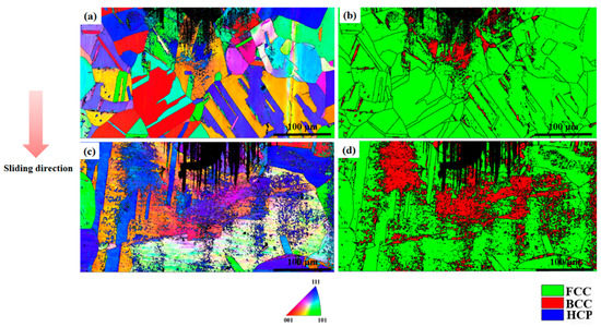 To investigate the effect of grain size on the stress-induced martensitic transformation behavior, the microstructure in the front part of the wear track of austenite steel samples with different grain sizes are compared. Figure 9 shows the comparison of the microstructure in the front part of the wear track for the 304 stainless steel with a grain size of 48 (Figure 9a,b) and 92 μm (Figure 9c,d) after dry sliding test with an applied load of 150 N. According to the phase map, it can be seen that a considerable larger amount of martensite was formed in the front part of the wear track of steel sample with a grain size of 92 μm (Figure 9d) than that of steel with a grain size of 48 μm (Figure 9b). The shape of martensite phase in the front part of the wear track in Figure 9a,b mostly shows a lath-like morphology while it turns irregular and consumes large volume of austenite parent grains, as shown in Figure 9c,d. Moreover, by comparing Figure 9b and Figure 7c which correspond to the applied load of 80 N and 150 N in austenite stainless with a grain size of 48 μm, it can be seen that the volume of friction-induced martensite also increases with the applied load.