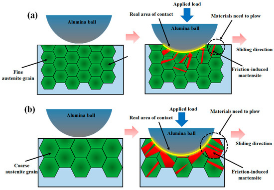 With the experimental observation and analysis carried out above, the mechanism responsible for the effect of grain size on the friction-induced martensitic transformation and the tribological performance of austenite stainless steel is proposed and schematically illustrated in Figure 10. When the alumina ball slides against the austenite stainless steel, the adhesion component and plowing component determines the values of COF and wear behavior [43]. As the adhesion component is a function of material pair, sliding environment, and real area of contact, it is expected that the variation of austenite grain size influences the adhesion component by affecting the real area of contact in the present study [44]. According to the experimental observations in Figure 4 and Figure 5, it can be seen that austenite steel with a coarse grain leads to a wider wear track and a rougher contacting surface, leading to a larger real area of contact, as shown in Figure 10b. Therefore, the increase of austenite grain size increases the adhesion component during dry sliding and lowers the wear resistance of austenite stainless. The plowing component depends on the degree of plastic deformation taking place at the asperity level [29,31]. It is presented in Figure 4 and Figure 9 that a severer plastic deformation occurs in front of and besides the wear track for the sample with a coarser grain size, which is reflected by the larger amount of friction-induced martensite. Therefore, the amount of materials that the subsequent sliding needs to plow increases with the increase of grain size (Figure 10b). Moreover, as the amount of the martensitic transformed increases with the grain size, the larger volume fraction of martensite acting as a reinforcing phase will more effectively inhibit the movement of the alumina ball, further increasing the plowing component. These effects discussed above contribute to the friction and wear performance of austenite stainless steels.