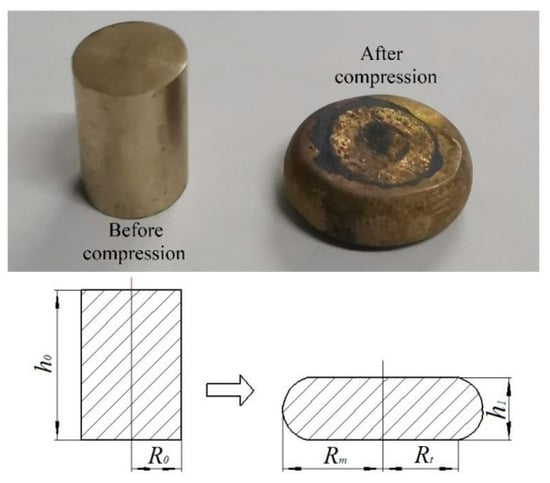 where B is the barreling coefficient; h1 is the height of deformed specimen; RM is the maximum radius of the deformed specimen; R0 and h0 are initial radius and height of the specimen, respectively, see Figure 1.
