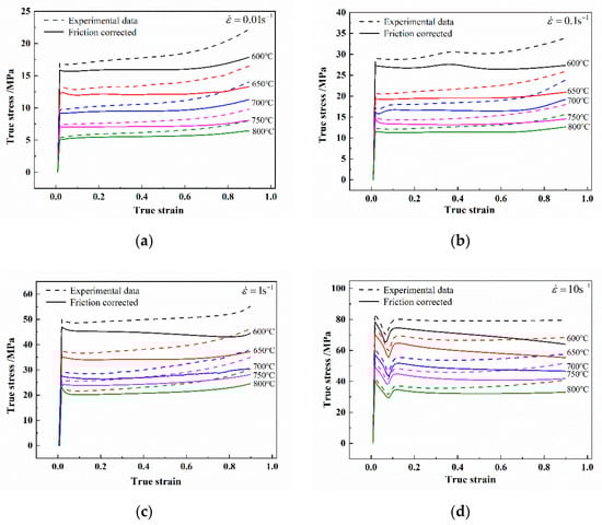 Using Equations (2)–(5), the friction correction of the true stress-strain curves obtained through the experiment was implemented. The correction results are shown in Figure 3 (solid line). It can be seen that the corrected flow stress values are much lower than the measured ones. In addition, the effect of the friction increases with the increasing strain and strain rate as well as decreasing deformation temperature.
