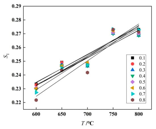 The relationship between S1 and T for various strain values can be obtained. The mean values of parameters m3 and m8 can be acquired from the intercept and slope of the lines, as shown in Figure 5.