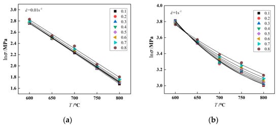 Here, S1 = m3 + m8T is set. The stress data with the strain ranging from 0.1 to 0.8 and interval being 0.1 at all deformation conditions were substituted into Equation (8). The scatter diagram of and at each deformation temperature was drawn and linearly fitted. The fitting results are shown in Figure 4, taking the results for T = 600 °C, T = 700 °C and T = 800 °C as examples. The slope of fitting line was the S1 value at the corresponding deformation condition.