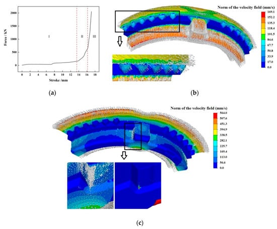 The force-stroke curve of plan 2 is shown in Figure 13a. According to the force change, the process can be divided into three stages. In stage 1, the material was thrown into the rectangular teeth cavity, and the top die was inserted into inner bore of the billet (see Figure 13b). In stage 2, the top die continued to press down, a small part of material flowed into the convex key cavity gradually (Figure 13c). In stage 3, the material filled the teeth and convex key cavities. The filling of teeth mainly depended on radial material flow. The material filling the convex key cavity was from both radial and axial flow; see Figure 13d. The numerical simulation of Plan 2 presented a reasonable material flow at the junction between the convex key and side wall. It prevented the folding defect like that in Plan 1 from appearing. In the numerical simulation of plan 2, the folding defect occurred only at the inner flash (see Figure 13e).