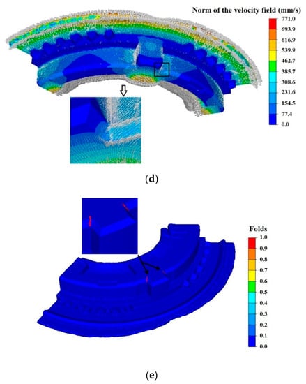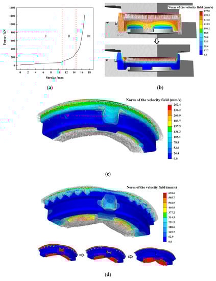 Numerical simulation of process plan 2: (a) curve of force vs. stroke, (b) velocity distribution in stage 1, (c) velocity distribution in stage 2, (d) velocity distribution in stage 3, (e) folds distribution in the last simulation step.