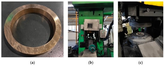 The billet used in the process experiment was prepared through cutting a hot extrusion tube (see Figure 14a). According to the billet size setting in the two process plans for numerical simulation in Section 4.1, two sizes of billets were prepared to implement the two process plan experiments. The billet was heated by a natural gas heating furnace. Hot precision forging was conducted on a numerical-control electric screwing press (see Figure 14b). Before forging, the die (Figure 14c) was preheated within the temperature range of 250–300 °C, and then sprayed with water-based graphite lubricant.