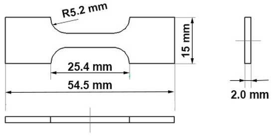 The tensile tests were carried out according to ASTM standard, and the dimensions of the specimens are depicted in Figure 1. Specimens were tested by a tension tester (CMT5305; MST, Jinan, China) with a stretching rate of 3.0 mm·min−1. An automatic extensometer (Sinotest, Changchun, China) was employed to record the strain values. The measurements were performed in ten duplicates, and the results are presented as mean value ± standard deviation (SD). One-way analysis of variance test was applied for comparisons of the means between different groups, with confidence intervals of 95.0% (*, p < 0.05) and 99.0% (**, p < 0.01), whilst NS stands for no significant difference. The fracture morphology and mechanism were analyzed by means of SEM (JCM-5000, Nikon, Kyoto, Japan) fitted with an energy dispersive X-ray spectrometer (Ametek, San Diego, CA, USA).