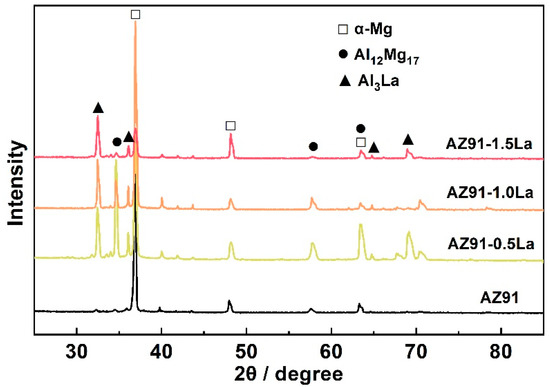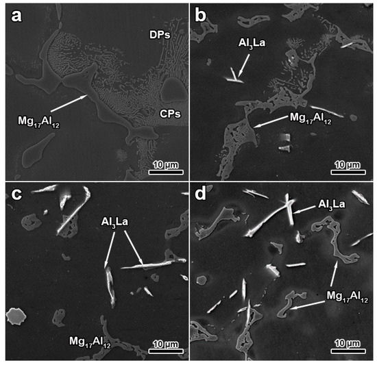The continuous network morphology of the Mg17Al12 phases along the grain boundaries in AZ91 alloy matrix was the main reason for its lower ductility. Many studies have been conducted in the past few years to improve the microstructural stability of AZ91 by deformation, heat treatment and alloying. Among the various methods, alloying was proven to be one of the most effective routes to adjust the microstructure and improve the mechanical properties of AZ91 alloy. Sn, Sb, Bi, etc. are usually introduced in the alloying of AZ alloys to improve their mechanical performance [11,12,13]. Previous results indicated that rare earth elements were relatively more effective in optimizing AZ91’s mechanical performance than other elements [8,14]. In AZ91 alloy matrix, rare earth elements (RE) could form Al-RE intermetallics, which increase its ultimate strength and its creep resistance [15,16]. It is well known that lanthanum is a low-cost RE element, which ensures its potential in large scale industrial applications [17,18]. Moreover, the thermal conductivity of magnesium alloys will not be greatly influenced by the addition of lanthanum content due to its low solid solubility in the magnesium matrix, which is crucial for heat sink products [6,19].