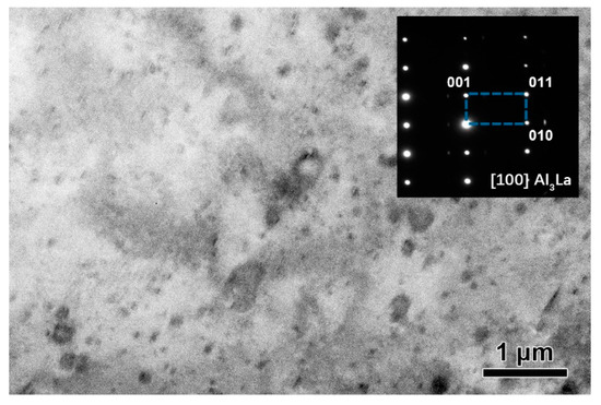 The XRD analysis results of the alloys are shown in Figure 4. α-Mg and Mg17Al12 as the primary species were identified in all the alloys, and the Al3La phase was analyzed in all three AZ91-La alloys [25]. The intensity of the signal peak was in direct proportion to the content of lanthanum in the alloy. The TEM investigation (Figure 5) further confirmed the phase identification results from the XRD analysis. It is notable that, besides the coarse Al3La precipitates observed in Figure 3, smaller sized Al3La phases were also found in the Mg matrix. Figure 5 also depicts the indexed [100] zone of bcc Al3La [18]. According to the microstructure observation and phase identification results, it can be concluded that lanthanum content existed in two forms in the alloy matrix, the isolated needle-like precipitates with an average size of 13.4 µm and the dispersed precipitates in micro scale.