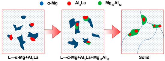 Al3La were mostly observed together with Mg17Al12 phases according to the microstructure results, indicating that the Al3La phase with higher melting point provided heterogeneous nucleation points for the Mg17Al12 phases. Therefore, more fully divorced Mg17Al12 precipitates formed while less partially divorced CPs and DPs generated with increasing lanthanum content. During the solidification process, the α-Mg matrix first solidified. Then, La element enriched at the solid–liquid interfaces, and Al3La phases were formed with the decreasing temperature (Figure 6). Previous research has successfully identified the habit plane between Mg matrix and Al3La phases [18,25]. Mg17Al12 preferentially solidified along the habit plane (11)Mg//(011)Al3La and further grew via the heterogeneous nucleation points provided by Al3La phases. Figure 6 depicts the model of the solidification process of AZ91-La alloys.