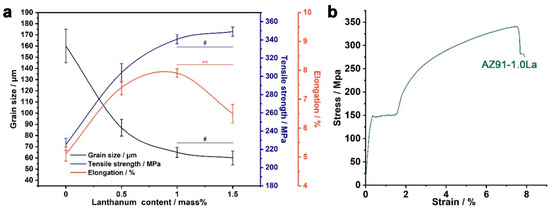 (a) The mechanical properties and average grain size of AZ91 alloy with different amounts of lanthanum content; (b) the stress–strain curve of AZ91–1.0La alloy; mean value ± SD is presented.