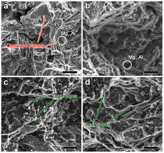 Greater lanthanum addition led to a refined alloy matrix and therefore effectively hindered the generation and growth of cleavage cracks, due to which the AZ91–1.0La showed the least density of cleavage plane on the fracture surface and the highest elongation among the three AZ91-La alloys [32]. Apart from the normal ductile fracture morphology, we also found two kinds of fractured particles with bright contrast (Figure 8). The particles mostly segregated along the grain boundaries and were identified as Zn containing intermetallics (Mg4Zn7 and MgZn2) by EDS analysis. The fracture morphology analysis hinted that fracture initiation sites mainly distributed around these intermetallics, which resulted in the transgranular ruptures and the decrease in elongation in AZ91–1.5La alloy.