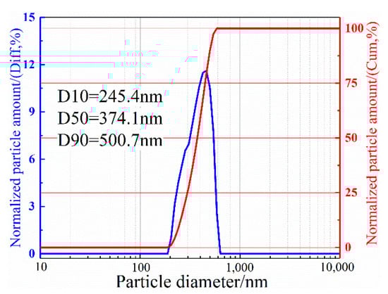 The rutile TiO2 (Tetragonal) used in the experiment is the nano-powder (as shown in Figure 1), and its particle size distribution is in the narrow range of 100–600 nm. The Mg particle size is 38–75 μm. The sample preparation pressure of the reactants was controlled to 25, 50, 75, 100, and 150 MPa, respectively. After 20 min, the whole compact was taken from the mold of the press for subsequent experiments and characterization. The specific experimental scheme is shown in Table 1.