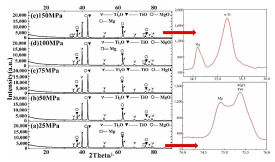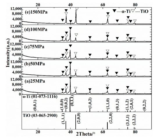 As shown in Figure 2, when the sample preparation pressure is 25 MPa (Figure 2a), the product is the low-valent titanium oxide phase represented by TiO, α-Ti and the MgO by-product, while a small amount of unreacted Mg exists; when the sample preparation pressure is increased to 50–75 MPa (Figure 2b,c), the titanium-containing phases of the product are TiO and α-Ti, and the diffraction peak of α-Ti phase tends to decrease, while Mg phase disappears; when the sample preparation pressure is increased to 100 MPa (Figure 2d), Mg phase appears in the product; and when the sample preparation pressure is increased to 150 MPa (Figure 2e), the diffraction peak of α-Ti phase in the product is remarkably lowered.
