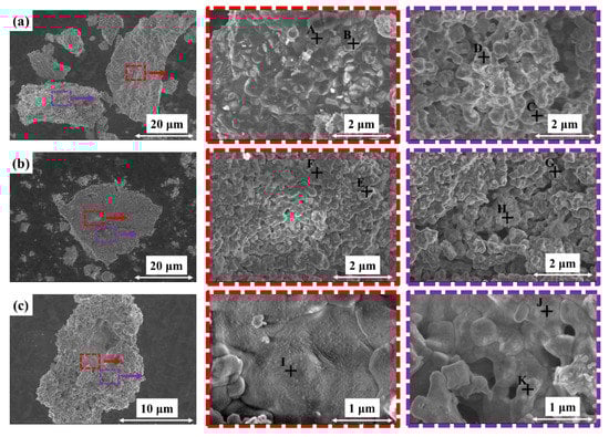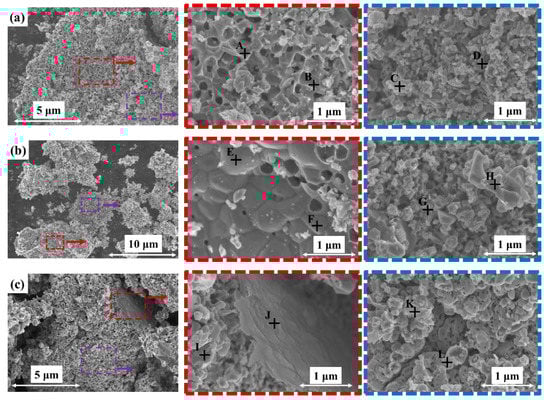 Figure 5 shows the microstructure of titanium-containing components in the combustion products of the Mg-TiO2 system at different sample preparation pressures after removal of Mg and MgO with hydrochloric acid. When the sample preparation pressure is 25 MPa, the product is an open-cell skeleton in which particles are stacked at a size of 1 μm (red region in Figure 5a) and 200–400 nm (blue region in Figure 5a). This diversity is due to the difference in the relative positions of the TiO2 particles with Mg during the combustion process, resulting in a difference in the order of contact with high temperature (sintering) or with Mg (reduction). As the sample preparation pressure is increased to 75 MPa, low-valent titanium oxide is sintered during the reaction (red region in Figure 5b), and the particle size is significantly enlarged. According to EDS analysis results in Table 3, the oxygen contents of points A and B are higher than those of points E and F, which is caused by the sintering of the titanium-containing compound increasing the distance of the oxygen atoms diffuse. Low-valent titanium oxide particles larger than 1 μm appear (point H in Figure 5b). This is due to the excessive sample preparation pressure causing the agglomerated TiO2 particles to contact more closely, forming particle groups. The titanium oxide is solid in the whole reaction process, and the liquid or gaseous Mg diffuses to the surface to form a “floating island”, and Mg can only react on the surface of the TiO2 particle groups and cannot react with each TiO2 particle alone. This also enlarges the distance of oxygen diffusion, leading to the advancement of the combustion end point, and, therefore, the oxygen content of the large particles is high (points G, H in Figure 5b and EDS analysis results in Table 3). When the sample preparation pressure continues to increase to 150 MPa, the open-cell skeleton in the dense zone is transformed into a closed-cell structure (red region in Figure 5a–c). At the same time, Mg content in the closed-cell region is high (point J in Figure 5c and EDS analysis result in Table 3). This is due to the reduced contact probability of the MgO by-product in the closed-cell region with H+ during acid leaching. At the same time, comparing the loose zone in the blue regions of Figure 5a–c, the size of the monomer particles constituting the skeleton structure also increases. This is also caused by the rapid “sintering” phenomenon between the titanium oxide particles.