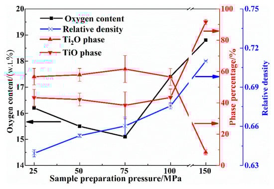 As shown in Figure 6, as the pressure applied to Mg-TiO2 compact increases, the relative density of the compact increases. The oxygen content in the product tends to decrease first and then increases, and the minimum value occurs when the sample preparation pressure is 75 MPa. In terms of phase composition, α-Ti phase and TiO phase simultaneously exhibit maximum and minimum values at 75 MPa. As the sample preparation pressure increases, the contact area of the reactants in the compact increases, and the porosity decreases. The former facilitates the combustion reaction, while the latter is unfavorable for the Mg diffusion of the process to continue to participate in the reaction. At the condition that the relative content and the particle size of the raw materials (Mg and TiO2) are the same, the proportion of the pores reserved for Mg diffusion in the compact and the contact area of the reactants can be determined by adjusting the sample preparation pressure in order to achieve the purpose of controlling the combustion reaction progress. At the condition of a sample preparation pressure of 25/75/150 MPa, using the Pt-30 Rh type thermocouple to measure the burning speed of the compact with a length of ~40 mm, they are 2.4/4.1/2.9 mm/s, respectively. This indicates that the sample preparation pressure affects the diffusion behavior of Mg, which in turn affects the combustion speed.