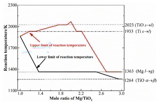 According to the calculation, the upper limit of the adiabatic temperature of the Mg-TiO2 system increases first and then decreases with the increase in Mg ratio, and traverses the melting points of Ti (Mg: TiO2 = 1.19–1.31) and TiO (Mg: TiO2 = 1.76–1.92). When the ratio is the theoretical equivalent (Mg: TiO2 = 2.0), the highest temperature (2067.6 K) is reached. As the Mg ratio is further increased, the adiabatic temperature decreases (excess Mg cannot participate further in the reaction and actually acts as a diluent), traversing the melting point of titanium (Mg: TiO2 = 2.11–2.21) and the boiling point of Mg (Mg: TiO2 = 2.70–3.00). The lower limit of the adiabatic temperature of the Mg-TiO2 system decreases with the increase in the Mg ratio, stays at the boiling point of Mg within a certain ratio (Mg: TiO2 = 1.37–2.50), and further decreases to the phase transition temperature of TiO (Mg: TiO2 = 2.94–3.00). According to the analysis, the adiabatic temperature of the Mg-TiO2 system is greatly affected by thermodynamic constraints of the reaction process. In the range of Mg: TiO2 = 1.00–2.70, the actual adiabatic temperature is in the range of 2067.6–1363.0 K; in the range of Mg: TiO2 = 2.70–3.00, the actual adiabatic temperature is in the narrow range of 1363.0–1264.0 K.
